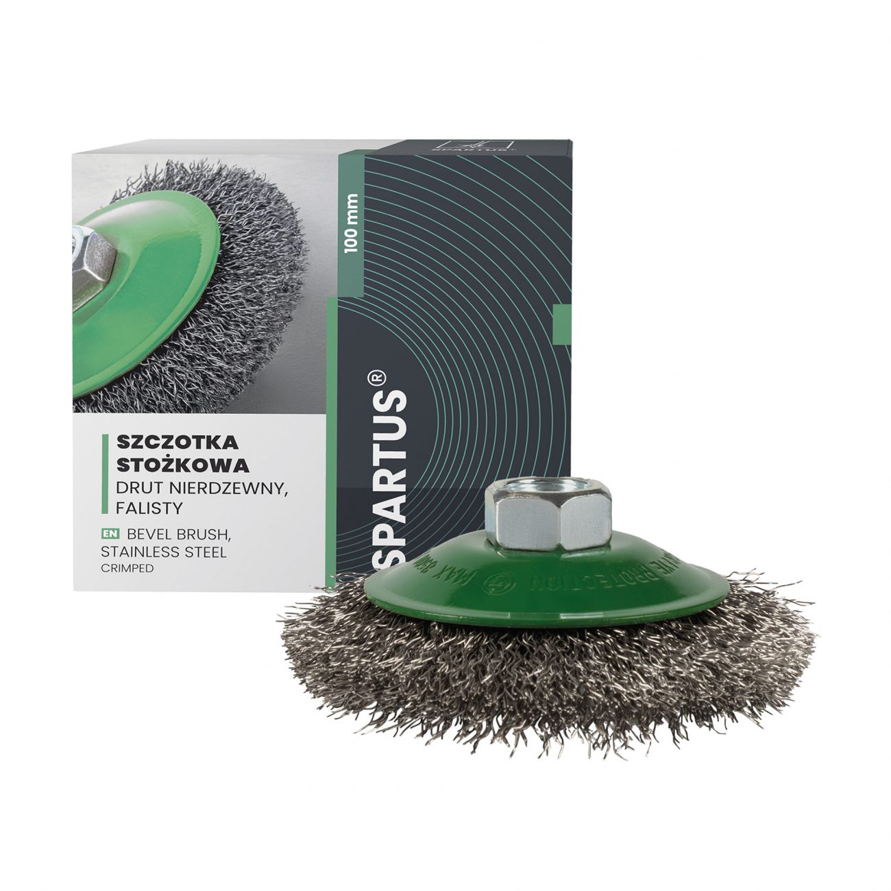 Szczotka stożkowa SPARTUS wykonana z wysokiej jakości drutu nierdzewnego to wytrzymałe narzędzie do szlifierek kątowych. Doskonale sprawdza się w pracy z elementami ze stali nierdzewnej, kwasoodpornej oraz metali kolorowych, zapewniając szybkie i dokładne usuwanie zanieczyszczeń bez ryzyka zanieczyszczenia powierzchni żelazem.