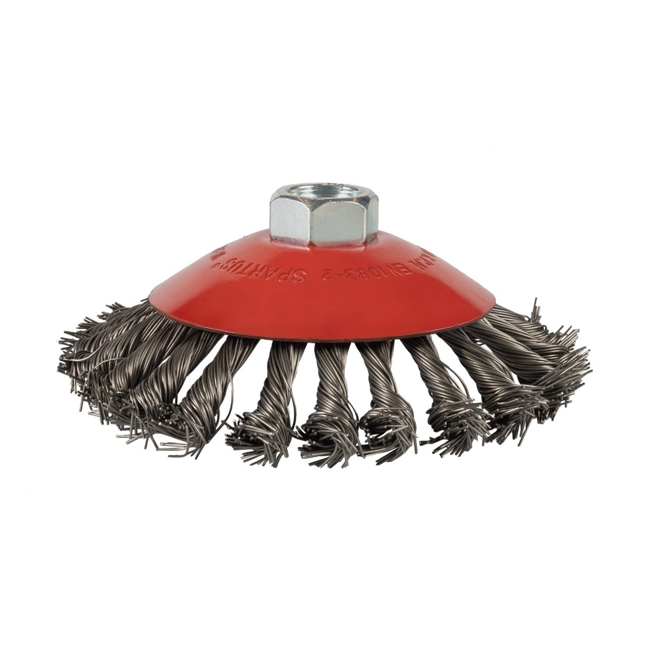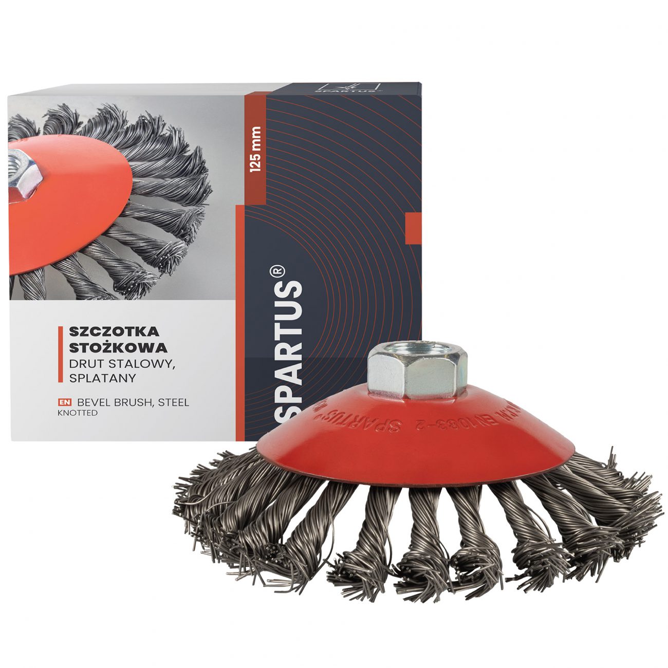 Szczotka stożkowa SPARTUS to wytrzymałe narzędzie do szlifierek kątowych, stworzone z wysokiej jakości drutu stalowego. Doskonale sprawdza się w intensywnej pracy, zapewniając szybkie i dokładne usuwanie zanieczyszczeń z metalu.