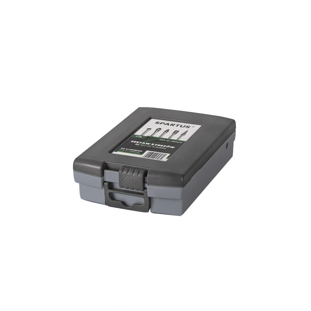 Zestaw jest umieszczony w trwałym, zamykanym opakowaniu, które chroni frezy przed uszkodzeniami, a jednocześnie pozwala utrzymać porządek na stanowisku pracy — idealne w warsztacie i podczas pracy w terenie.